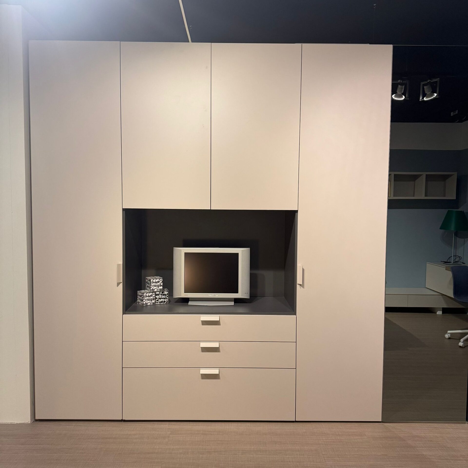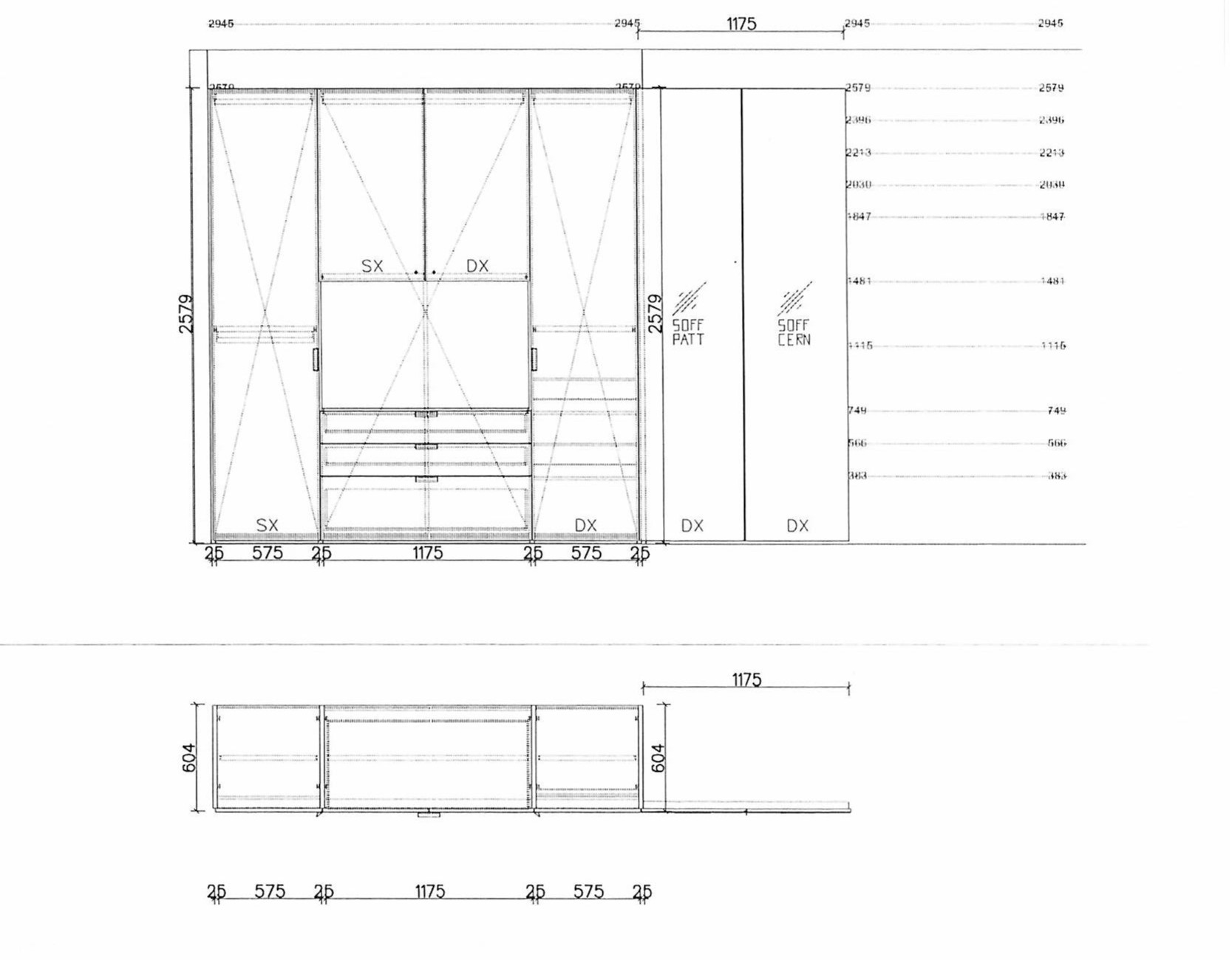 Armadio battente con maniglie con vano a giorno e ante con porta pieghevole a specchio, completo di attrezzatura interna.