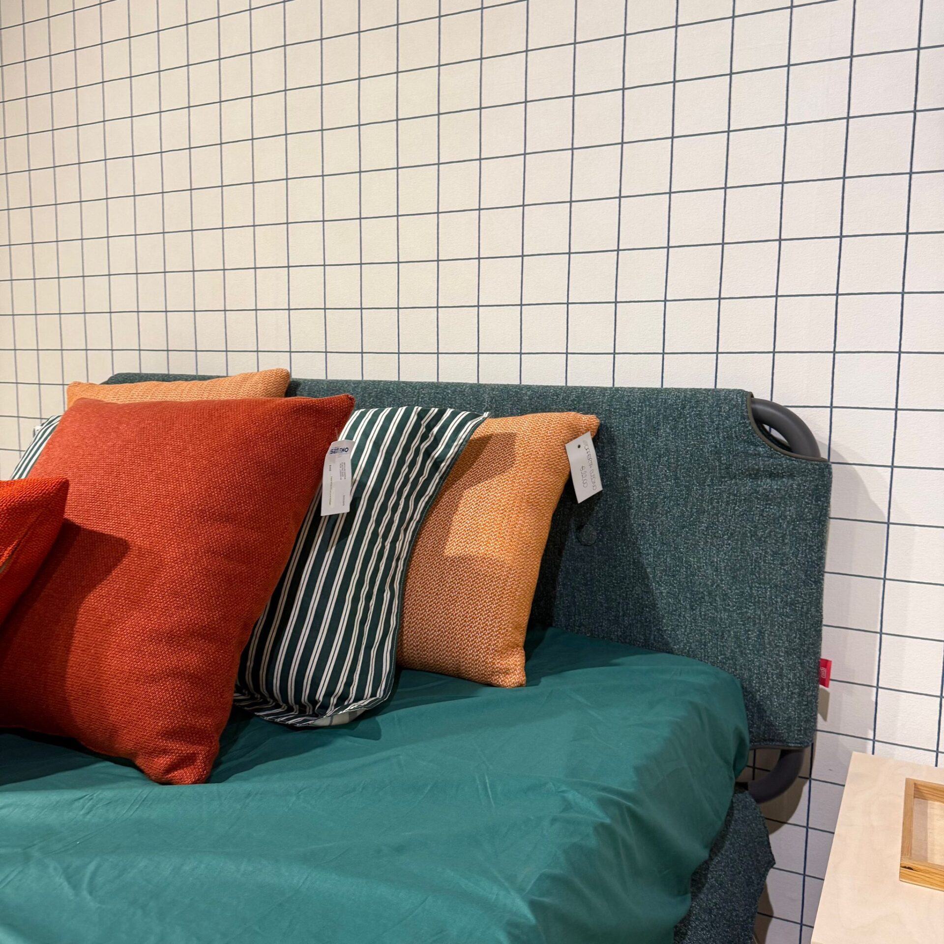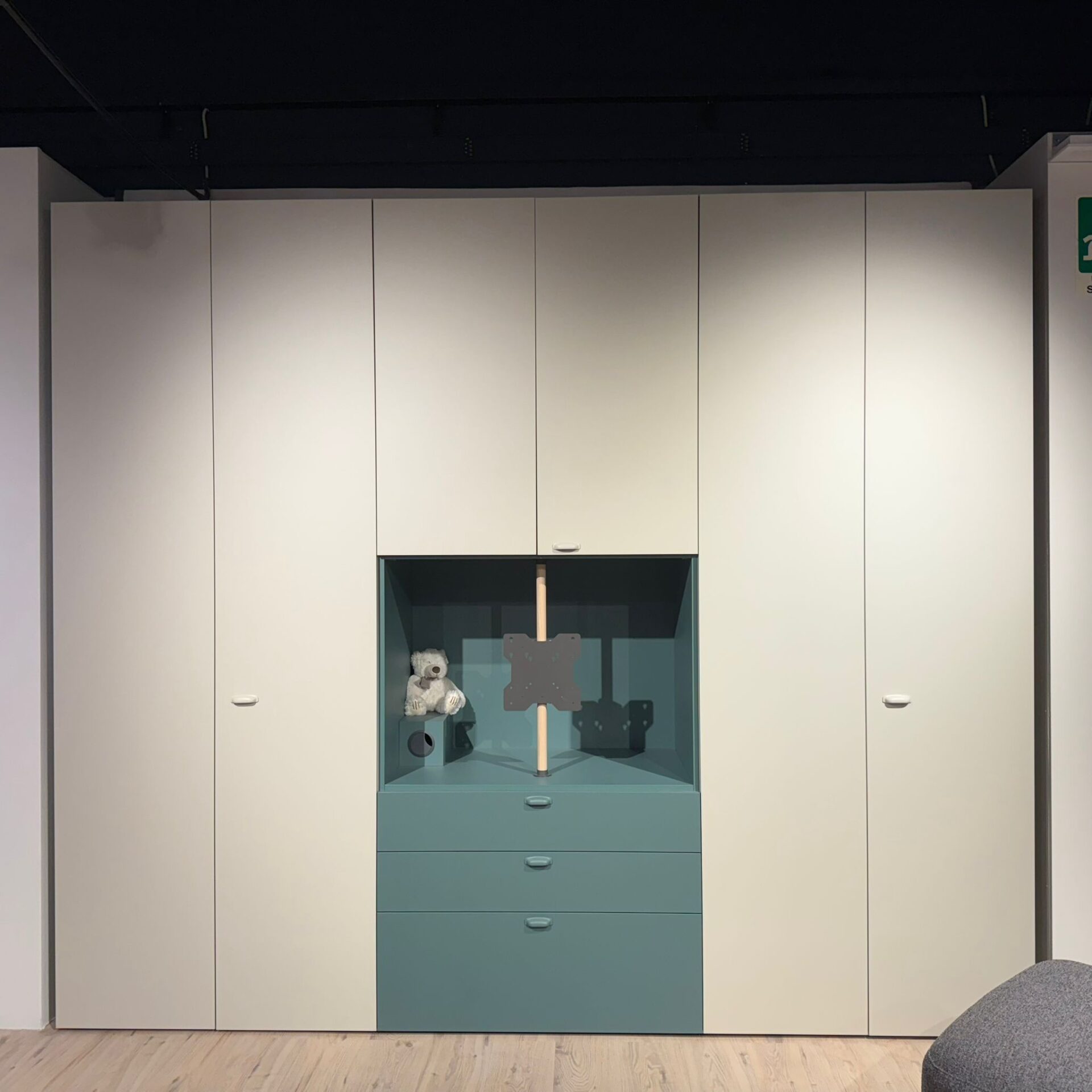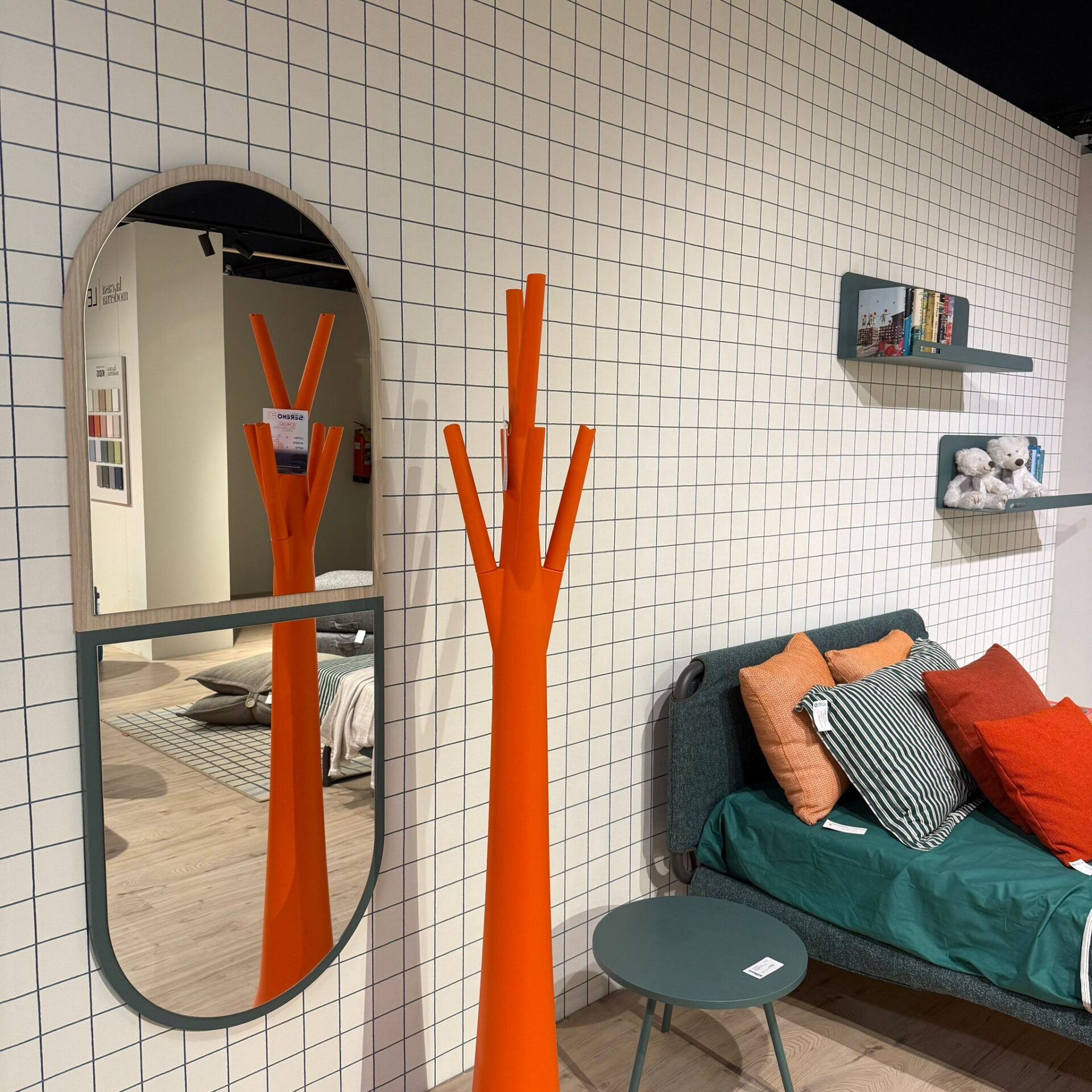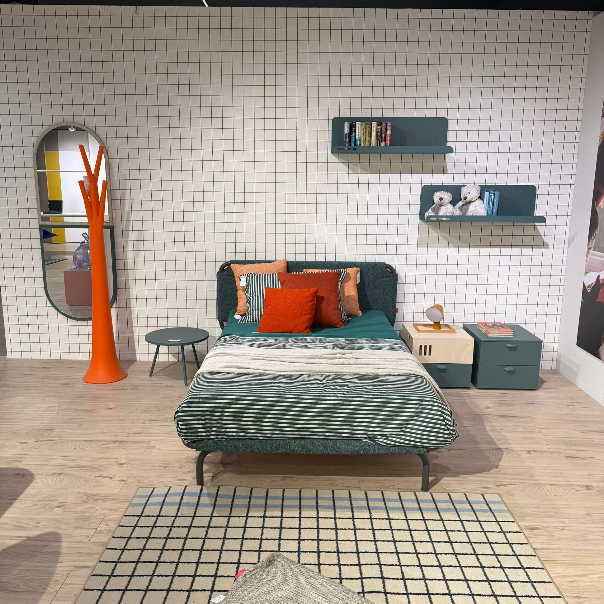 Cameretta Nidi completa di letto mod. Tube riv.T191 e struttura lavagna cm.146,5×209, materasso ortopedico cm.120×200, specchi Window finitura mandorlo e pino, mensole pino cm.90×27,4 H.25,8 e armadio battente finitura canapa e pino cm.300×61 H.257,9