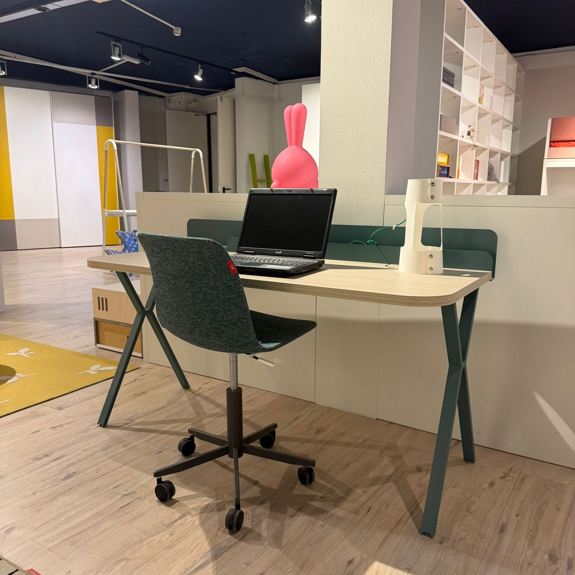 Scrittoio con piano finitura mandorlo e porta oggetti finitura pino, struttura con gambe a clessidra metallo finitura pino.