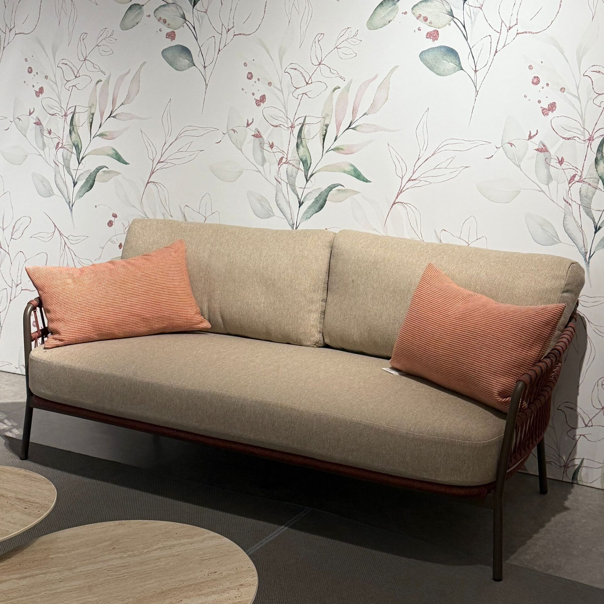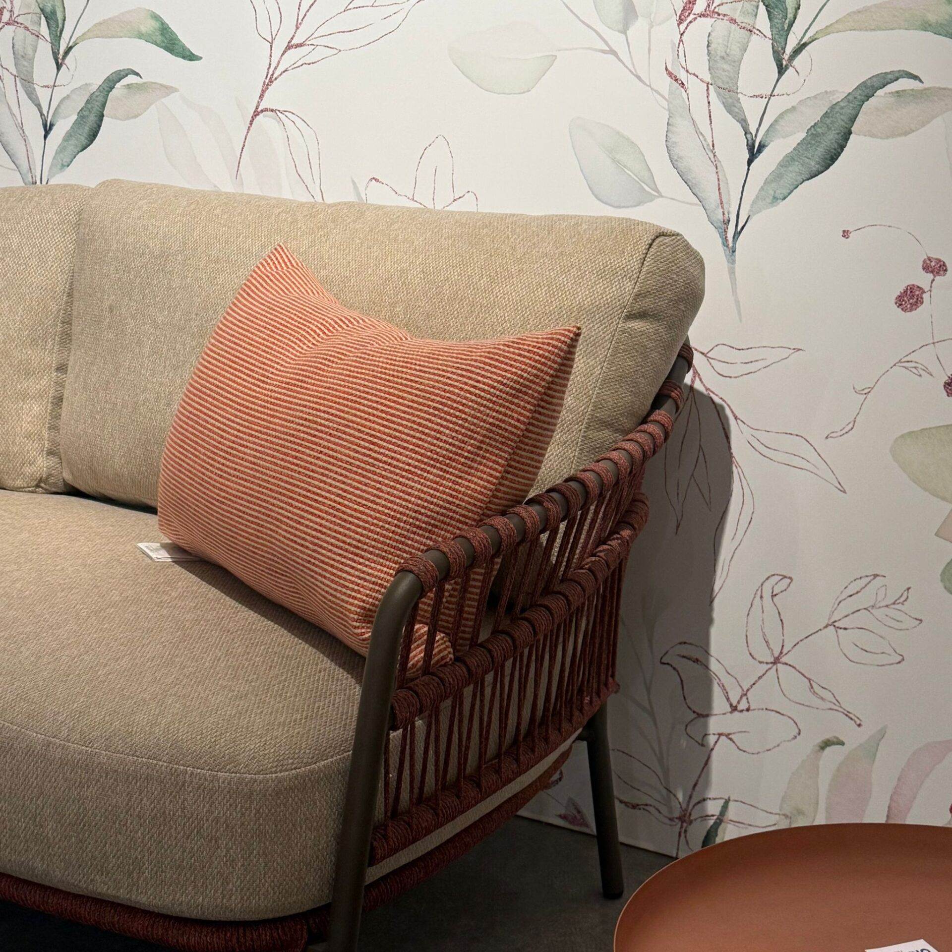Divano da esterno con struttura in acciaio e intreccio per esterno in corda con cuscini sfoderabili idrorepellenti.