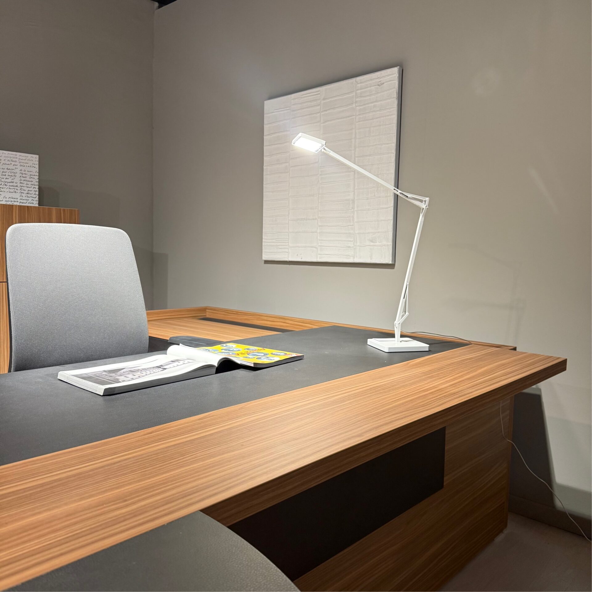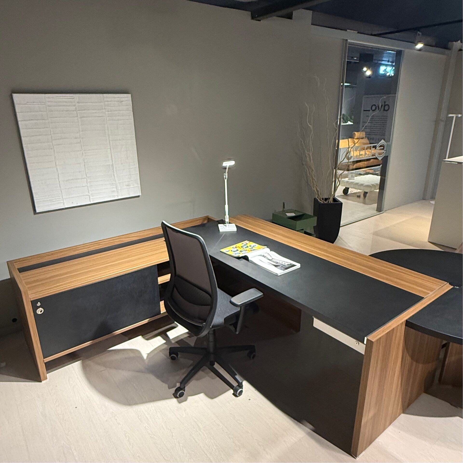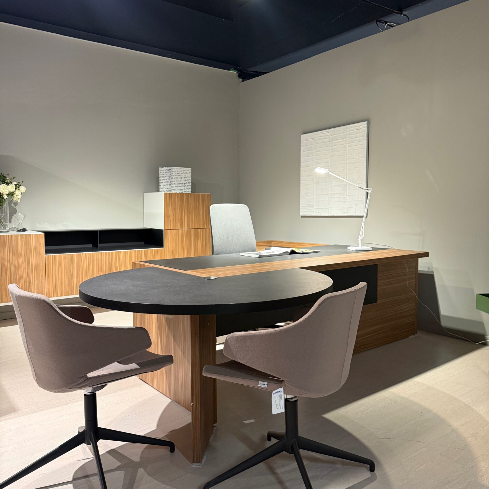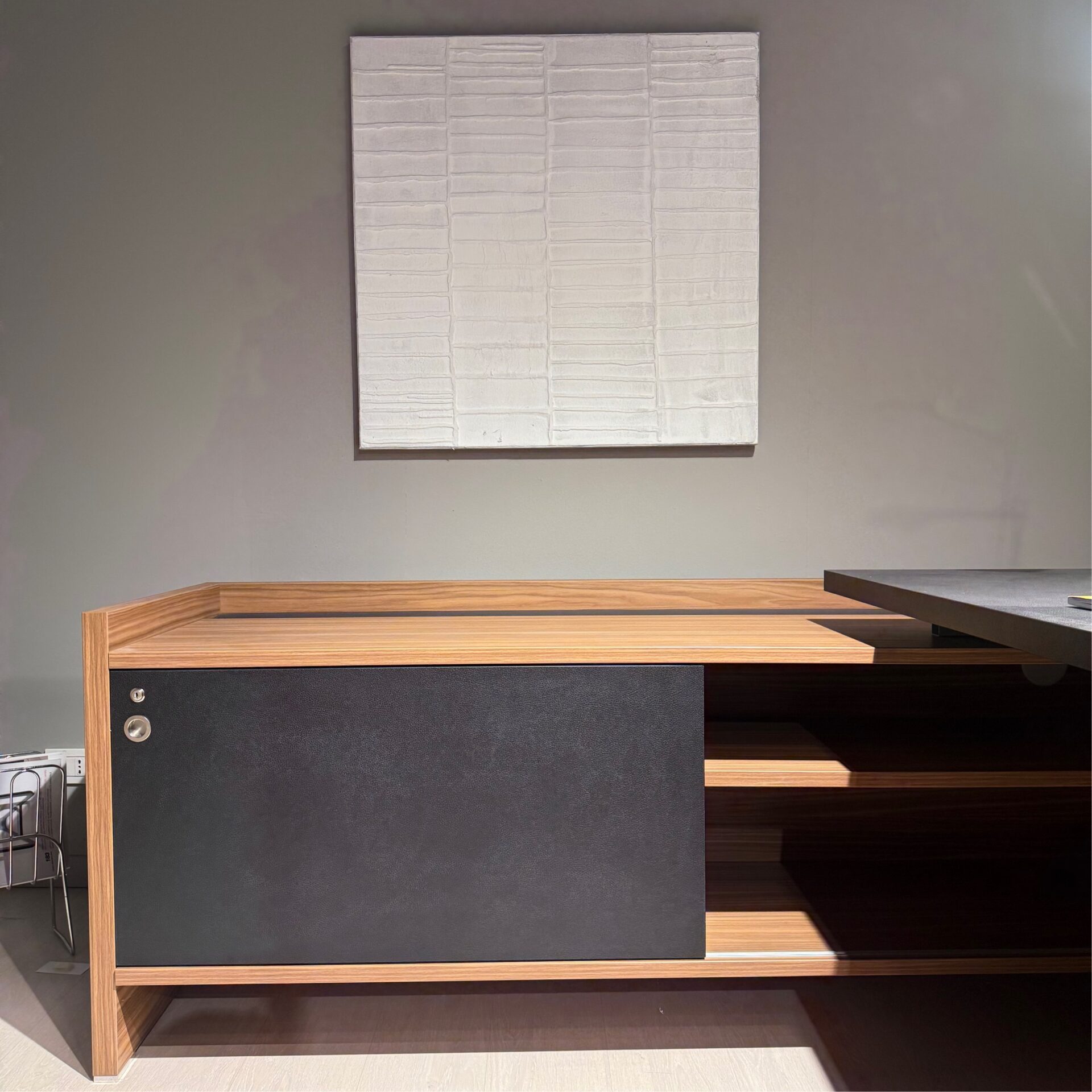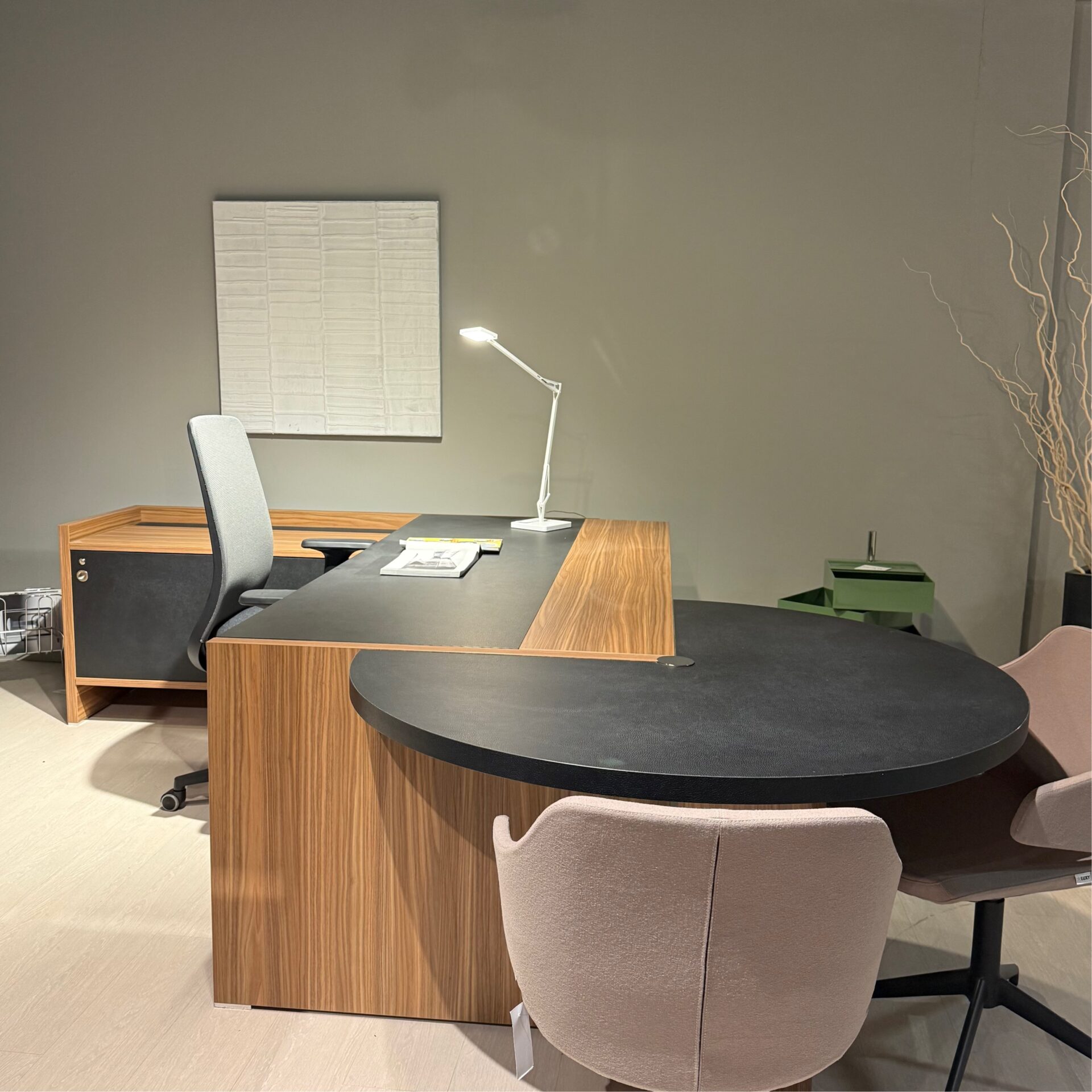 Scrivania modello Oxford composta da due lati più penisola, compresi i cassetti metallici.