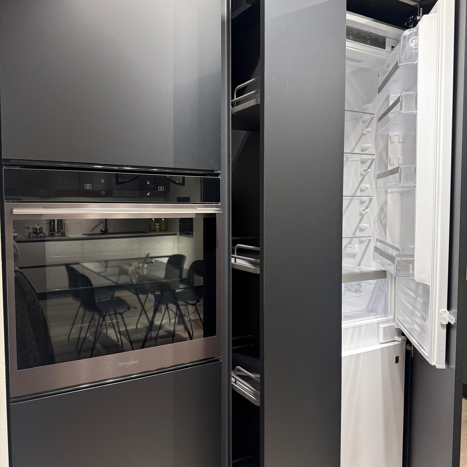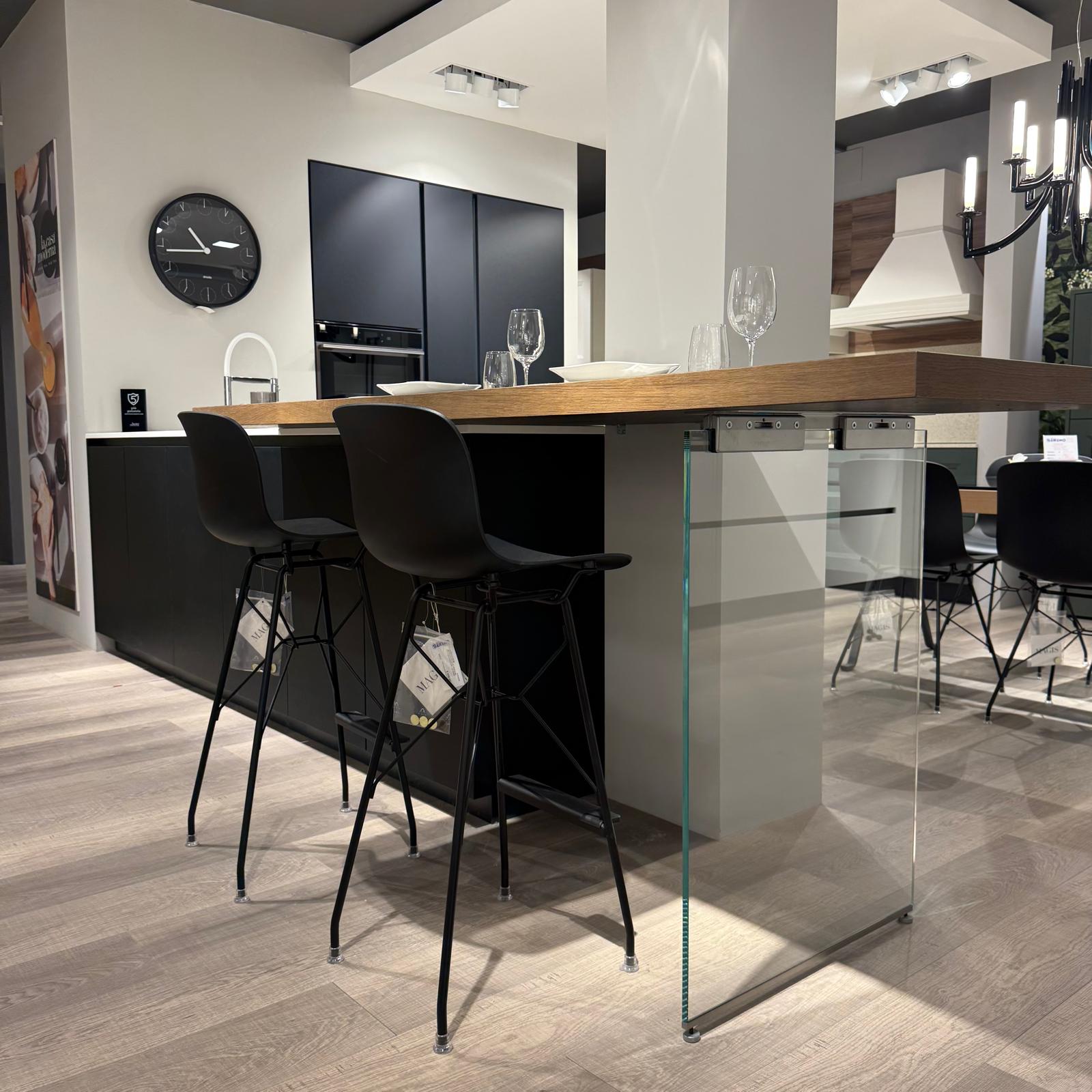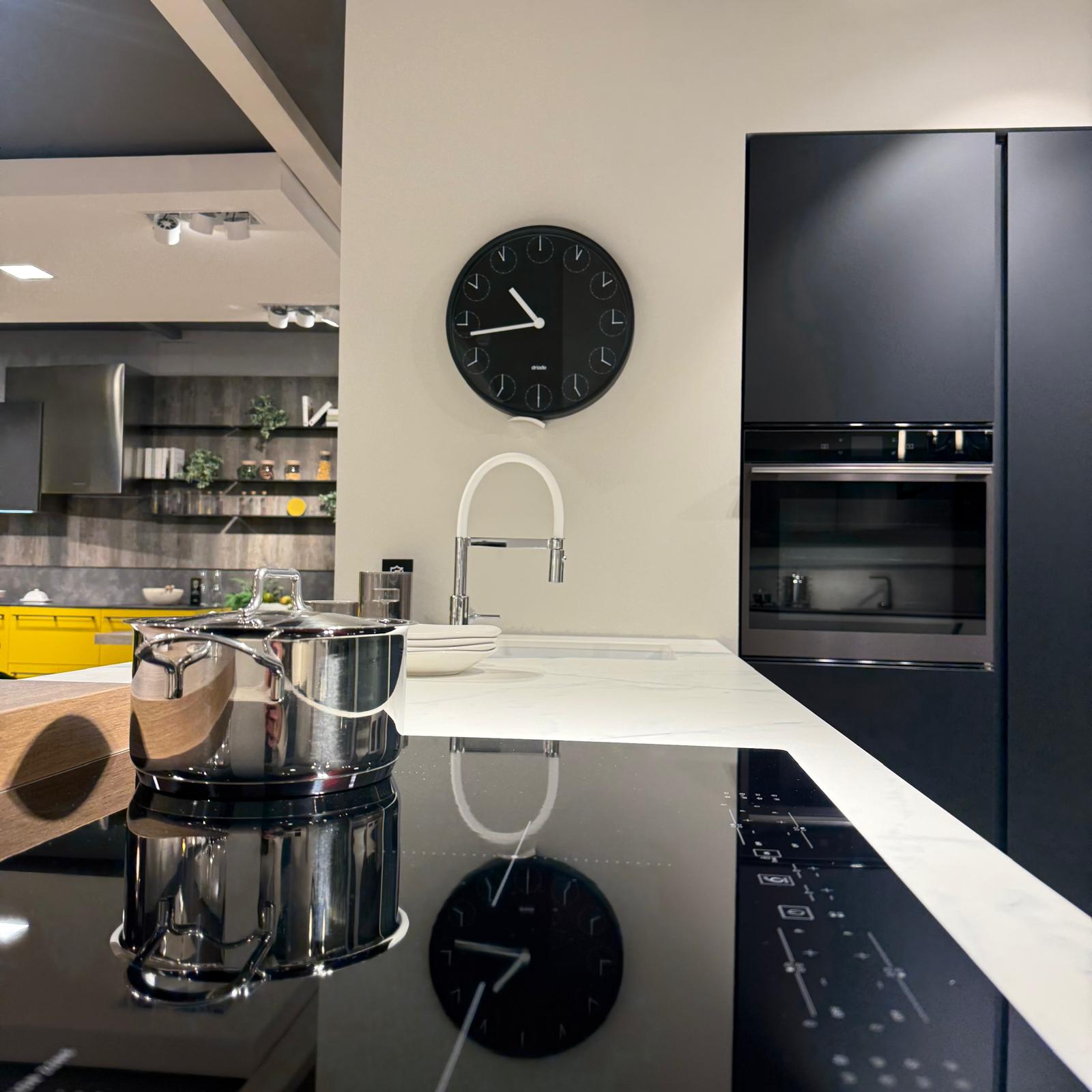 Cucina modello TREND finitura NERO SETA, gola e zoccolo LAVAGNA, piano snack impiallacciato sp.5 ROVERE DUOMO.