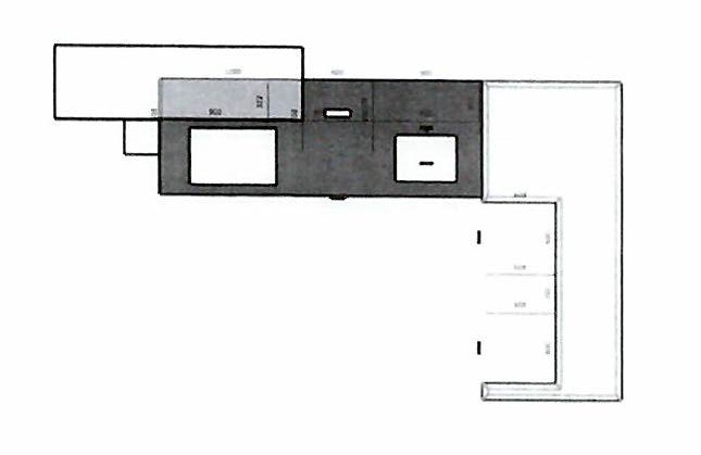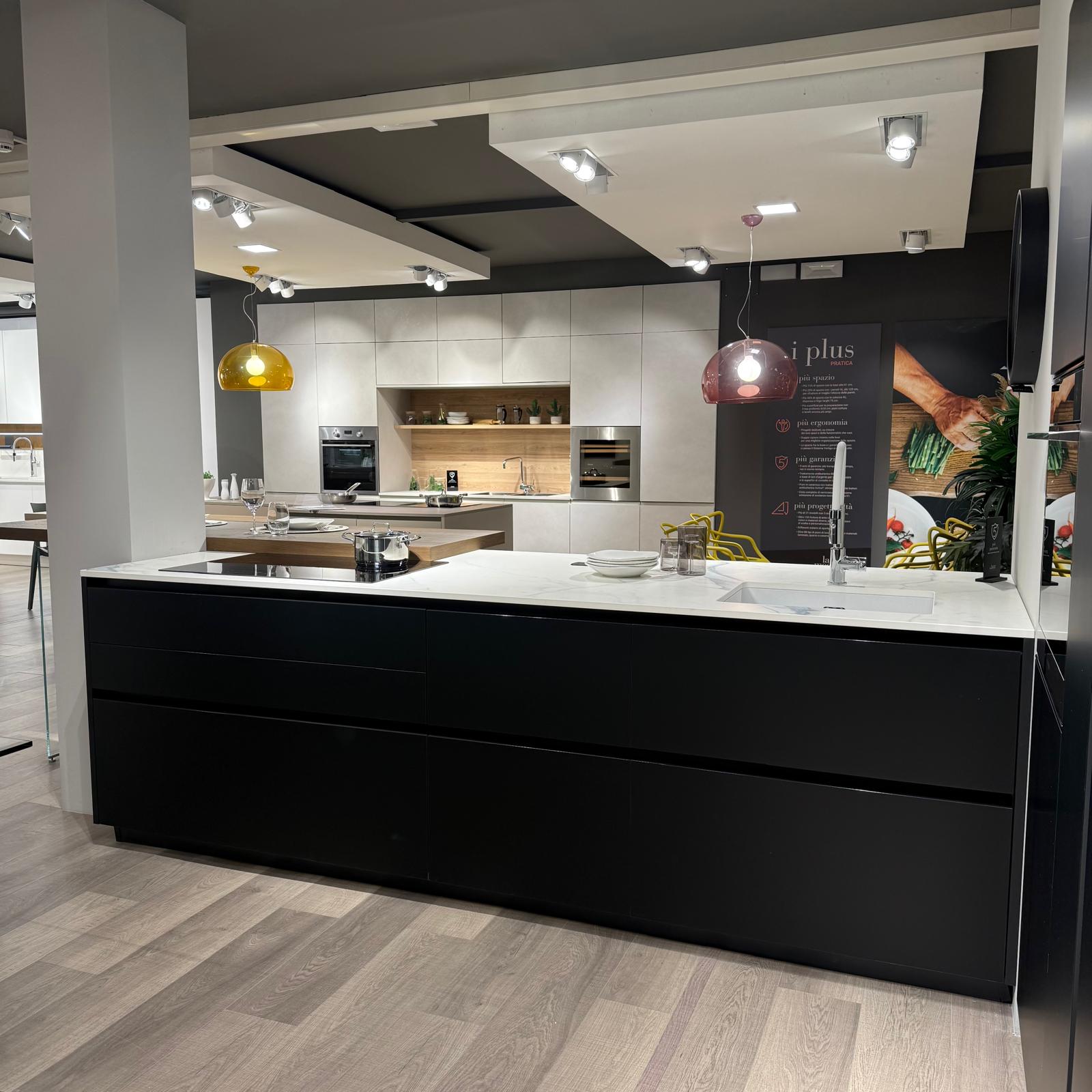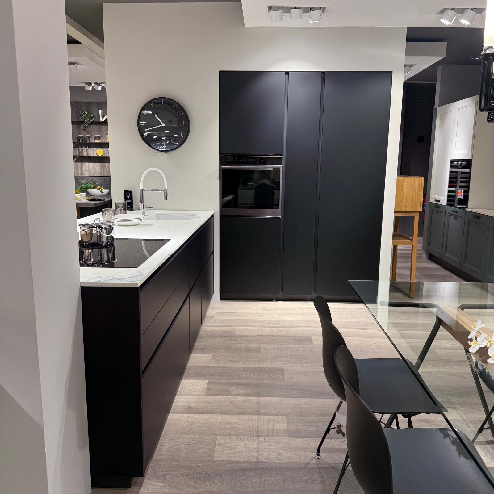 Cucina modello TREND finitura NERO SETA, gola e zoccolo LAVAGNA, piano snack impiallacciato sp.5 ROVERE DUOMO.