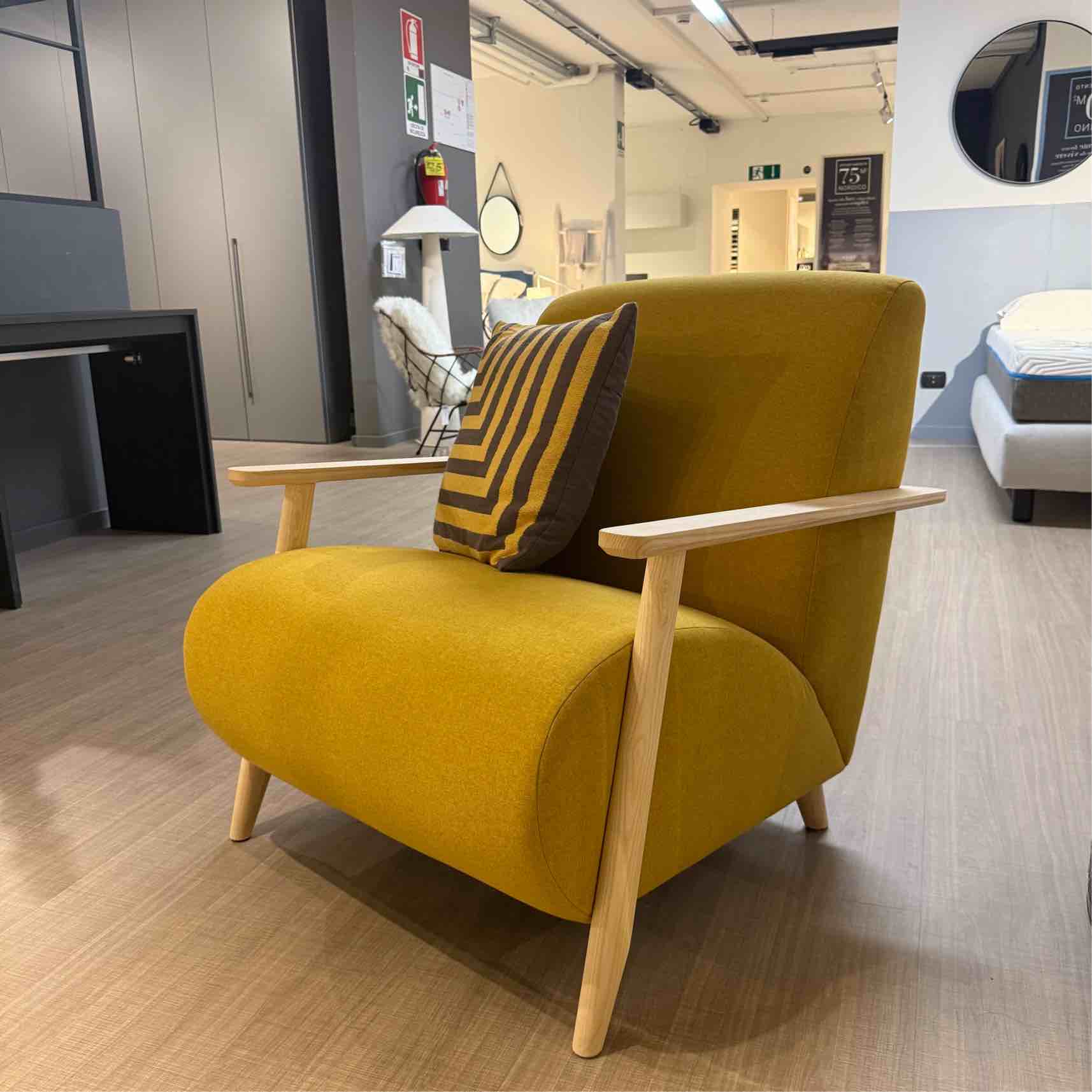 Poltrona modello Meghan in tessuto colore senape e struttura in legno frassino naturale.