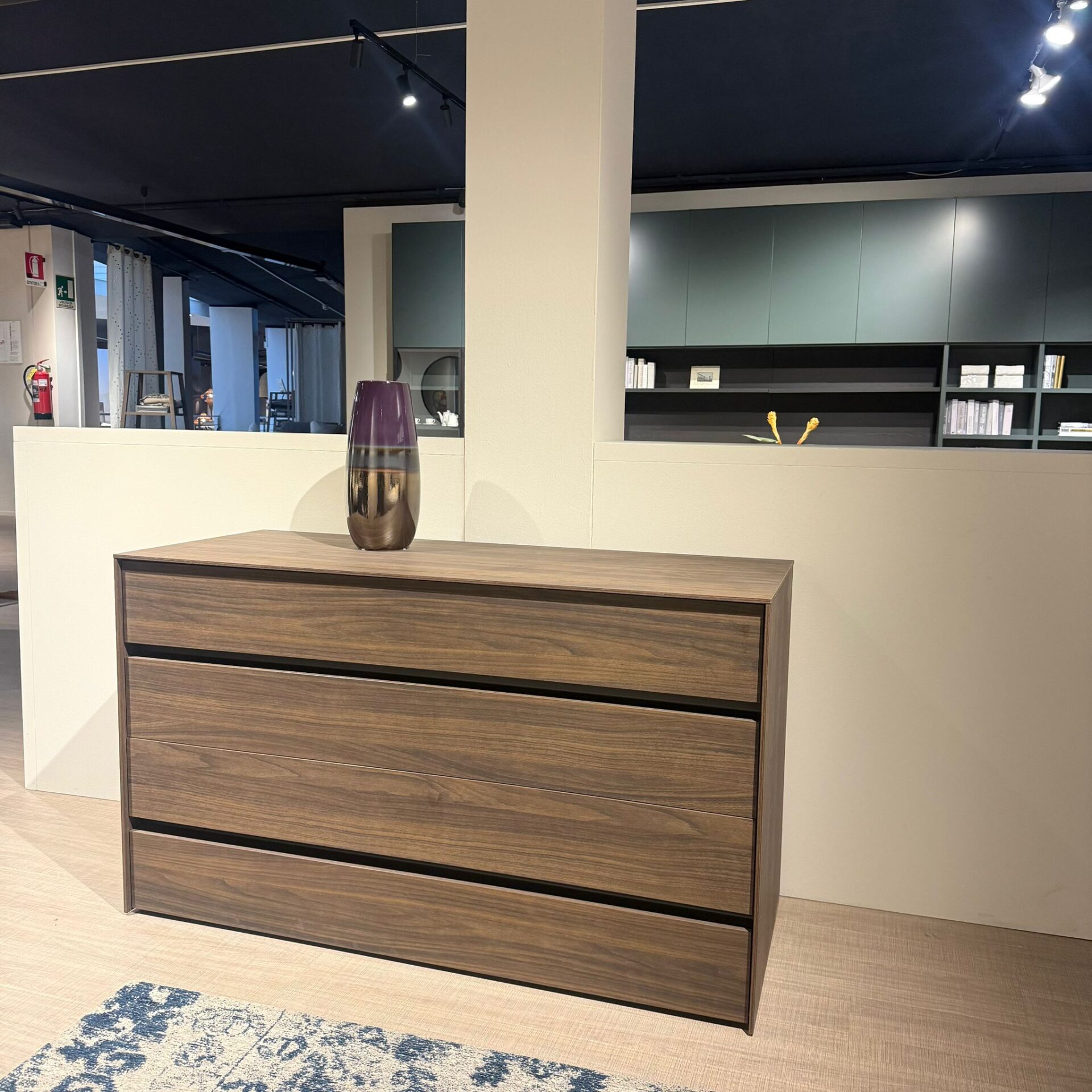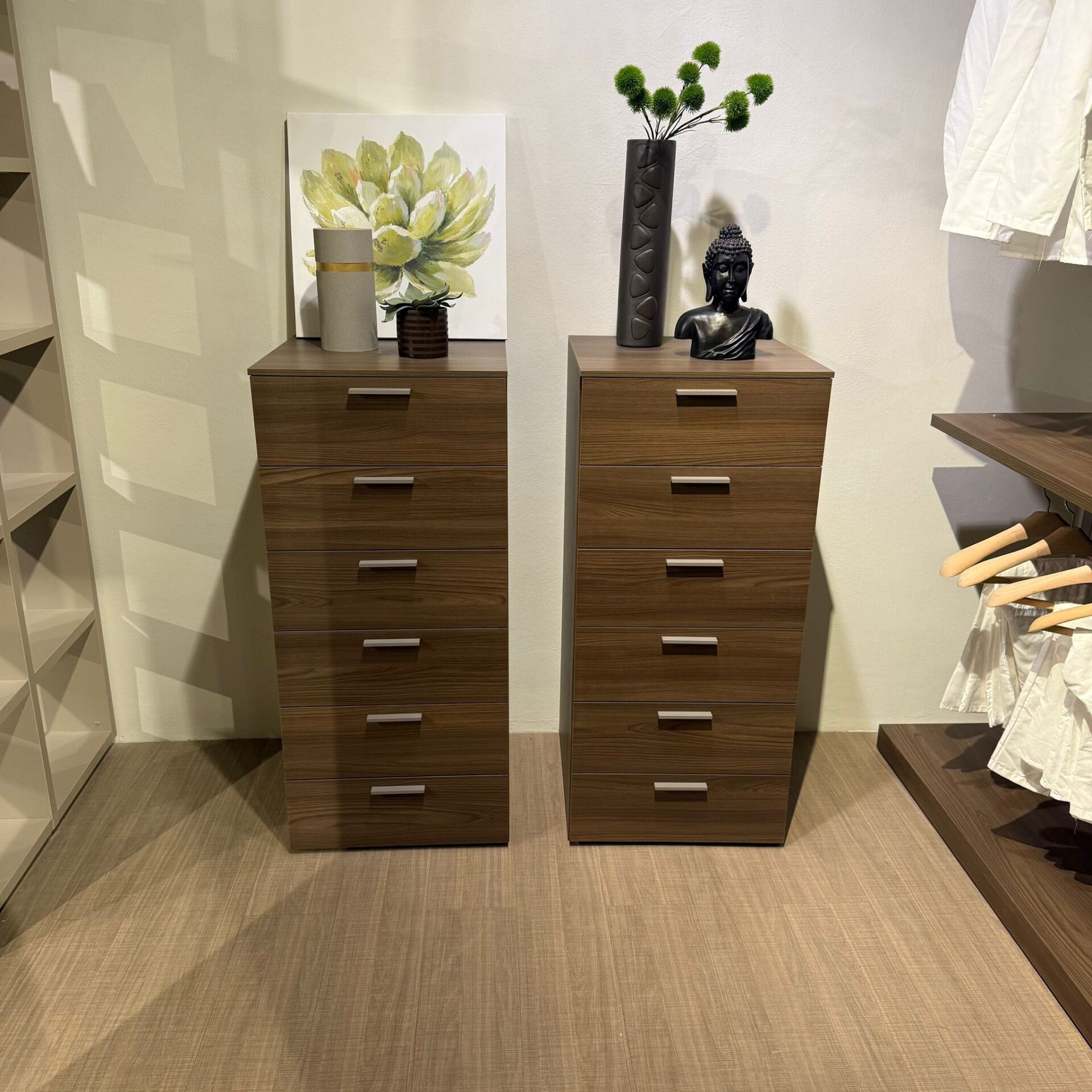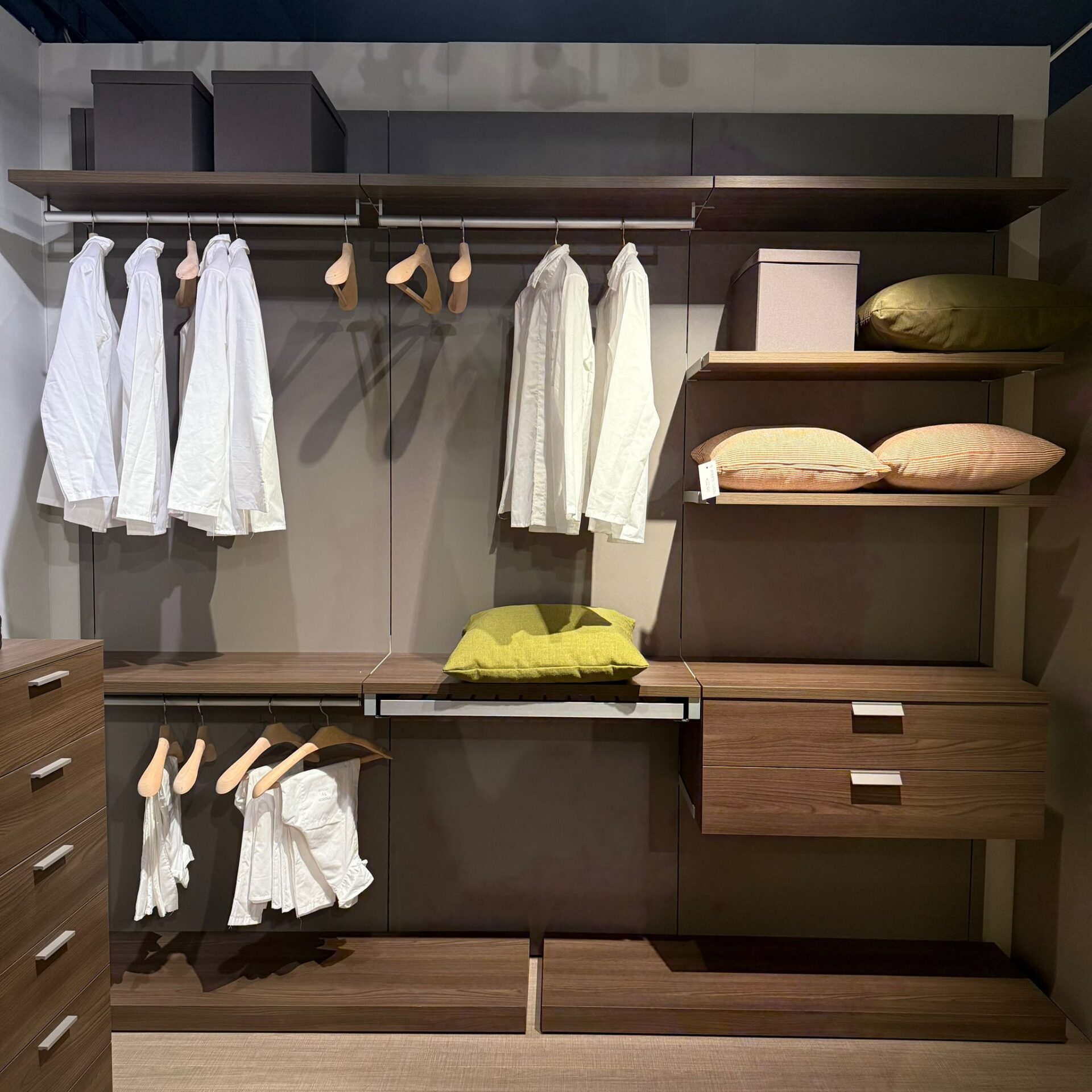 Armadio ad angolo Open con fianchi passanti e cassettiere.