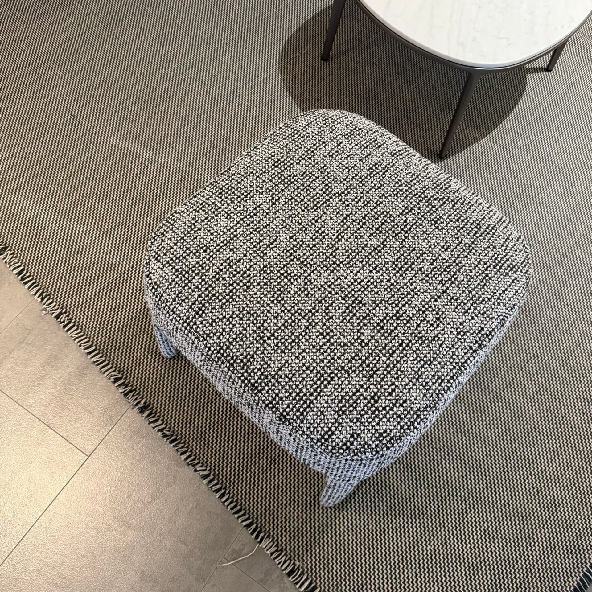 Pouf modello Febo rivestito in tessuto Levante Grigio con cucitura punto cavallo filo nero.