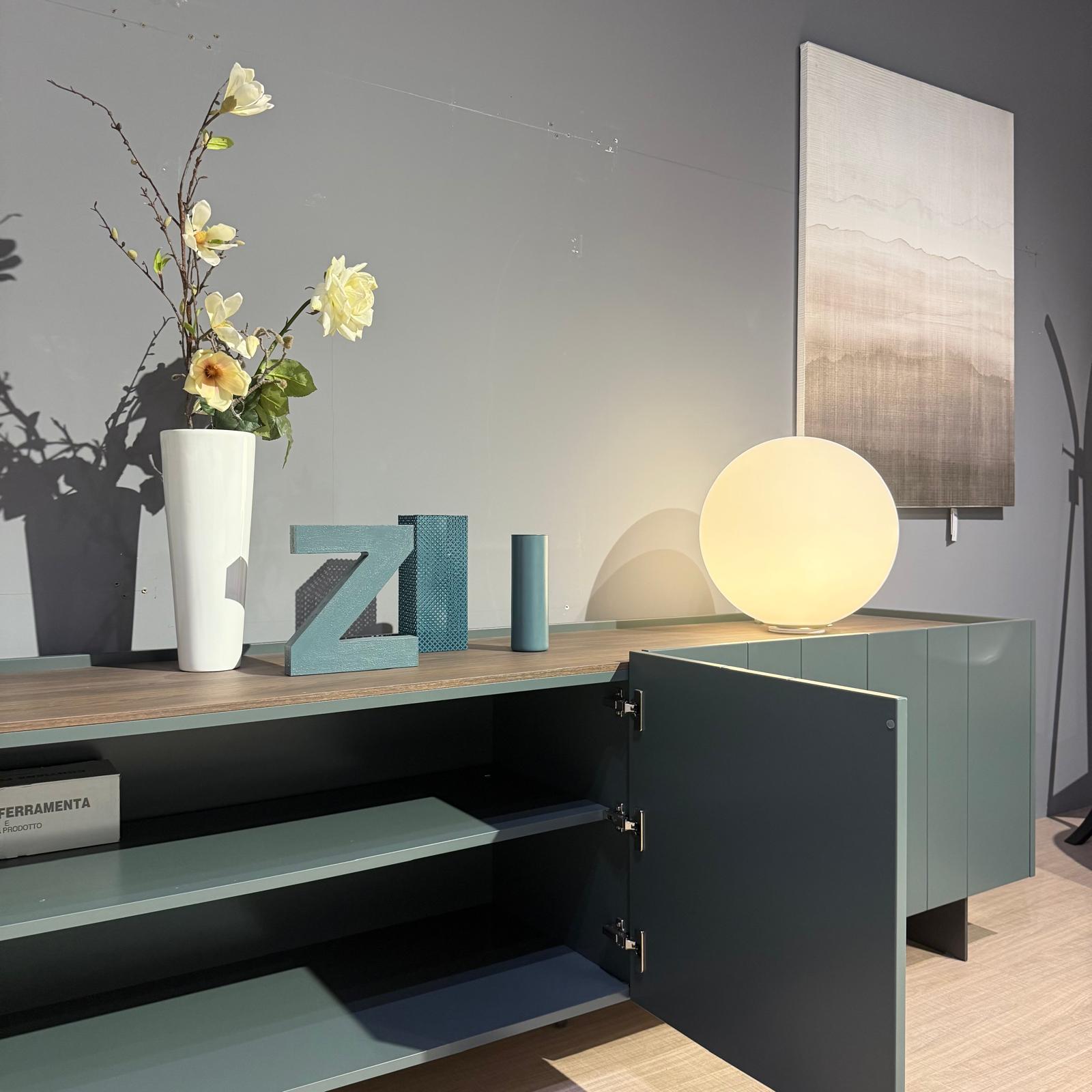 Madia modello Stripe 4 ante finitura Ginepro opaco, top in Noce e piedini Brunito Ossidato.