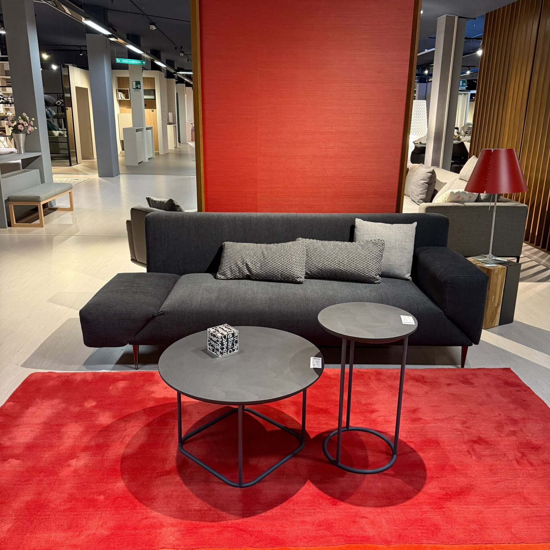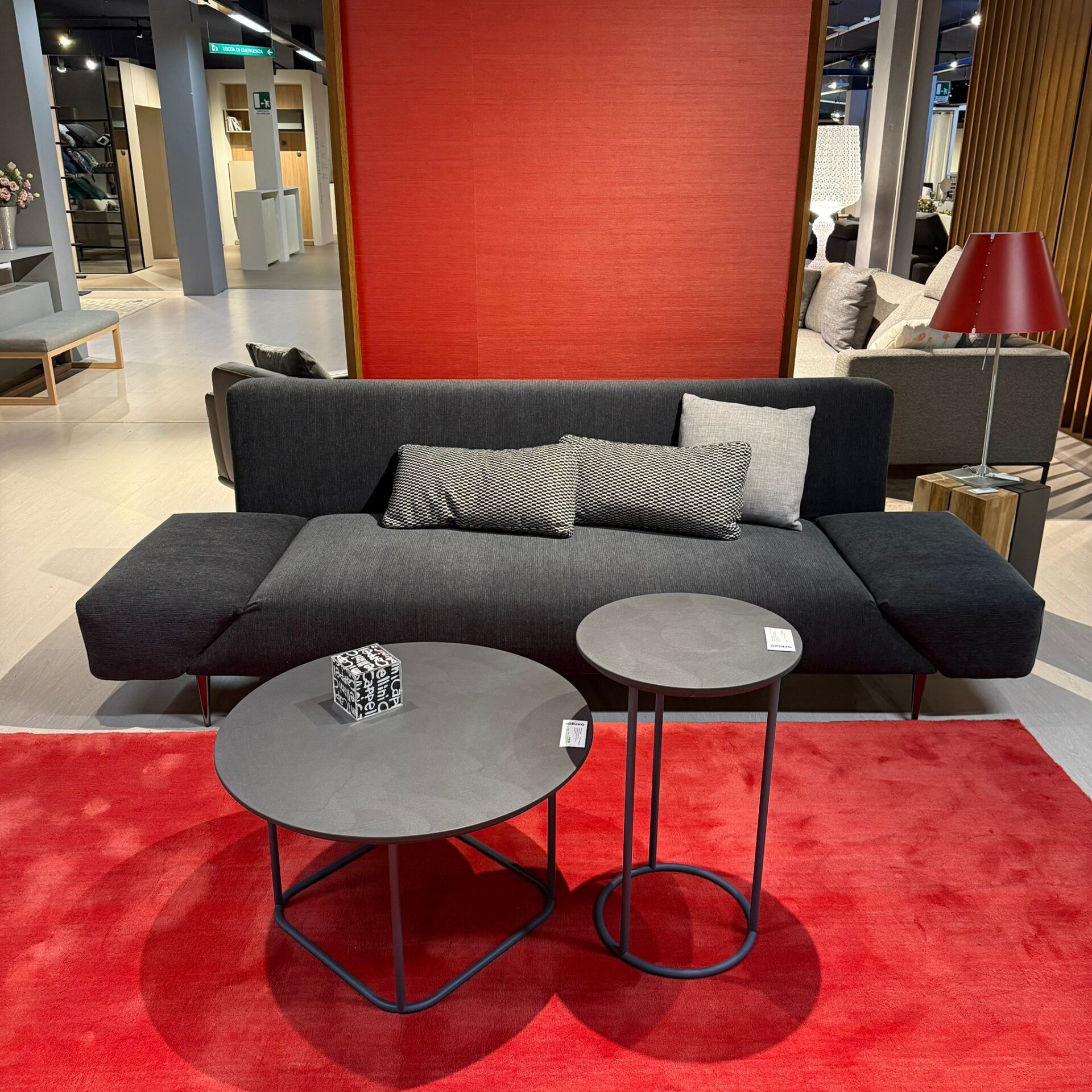 Divano modello Spin con braccioli girevoli in tessuto Road nero cat.F e piede Link nero.