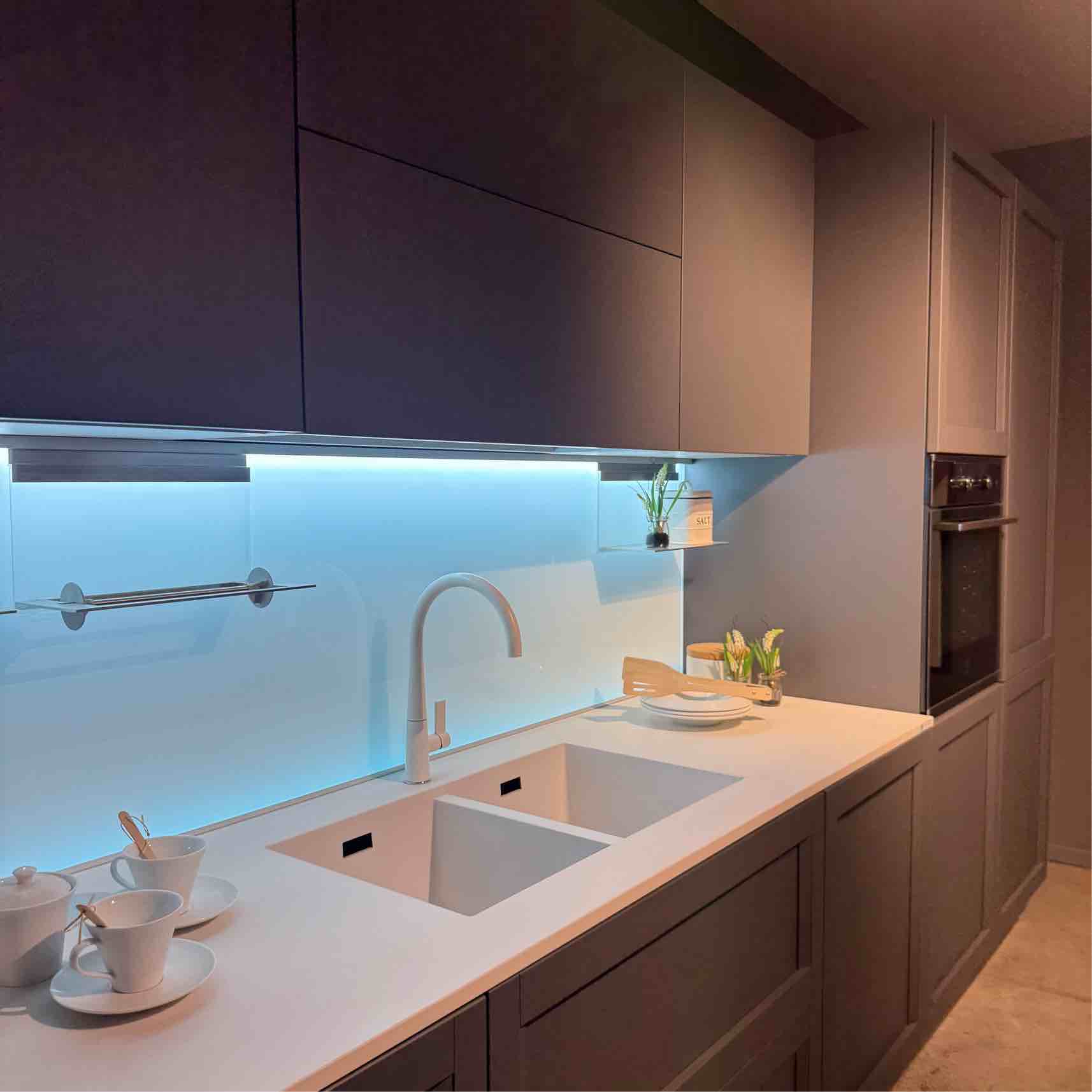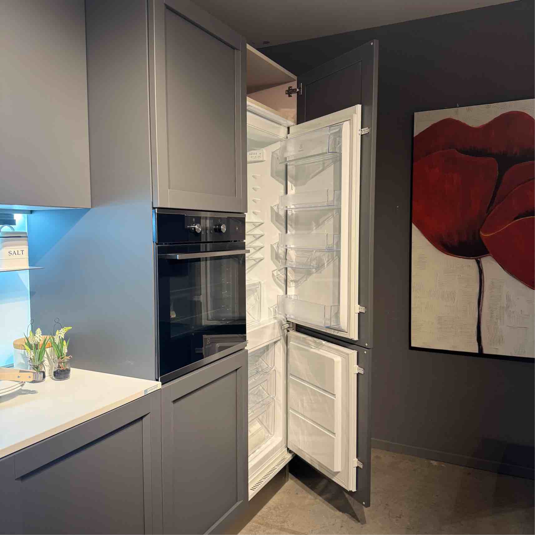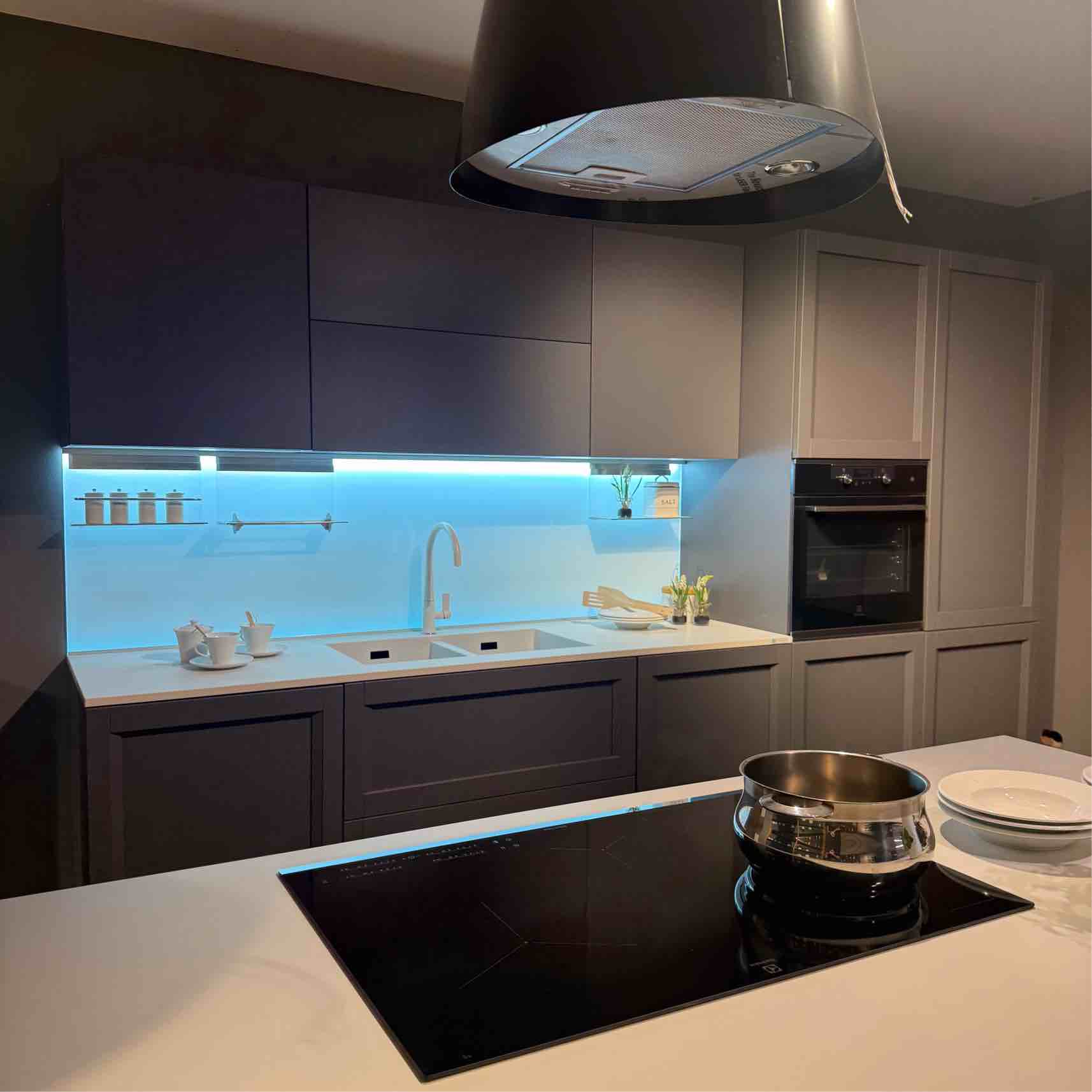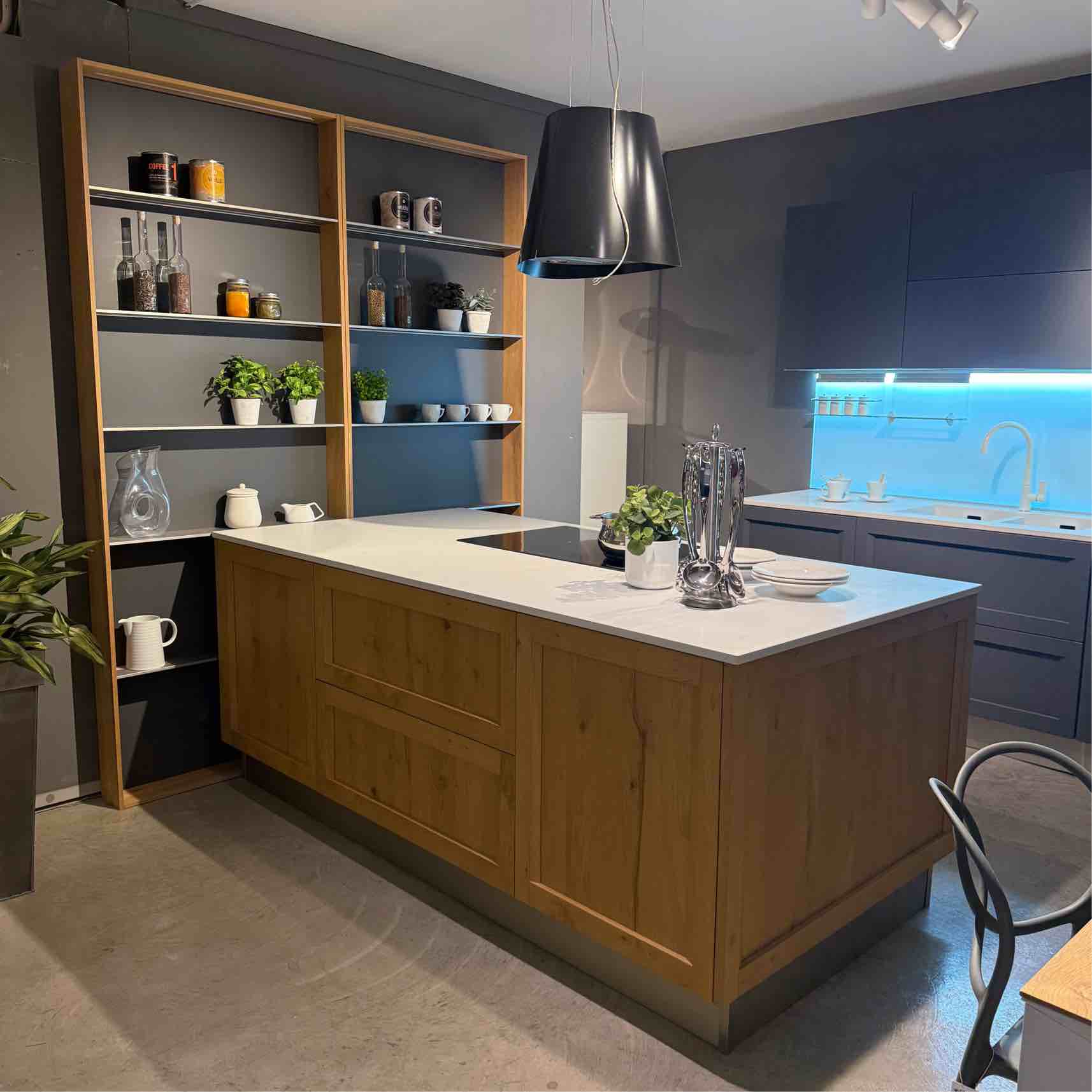 Cucina modello Milano completa di modulo Stepsystem, top (Caranto Quartz, fin. DOLOMITI bianco perlato) ed elettrodomestici Electrolux, lavello Elleci.